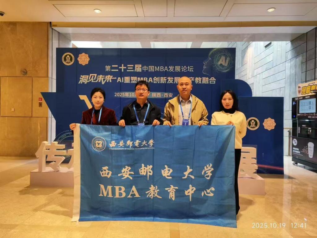 10月19日,由西安电子科技大学主办的第二十三届中国MBA发展论坛在陕西宾馆启幕。来自全国百余所高校的专家学者、领军企业的管理精英、MBA师生及校友代表齐聚一堂。西安邮电大学经济与管理学院院长苏锦旗及MBA教育中心主任刘晓娴带领学生参加会议。此次会议的主题是“洞见未来:AI 重塑 MBA 创新发展与产教融合”。
